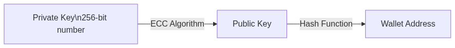 Private key → (ECC) → Public key → (Hash) → Wallet address