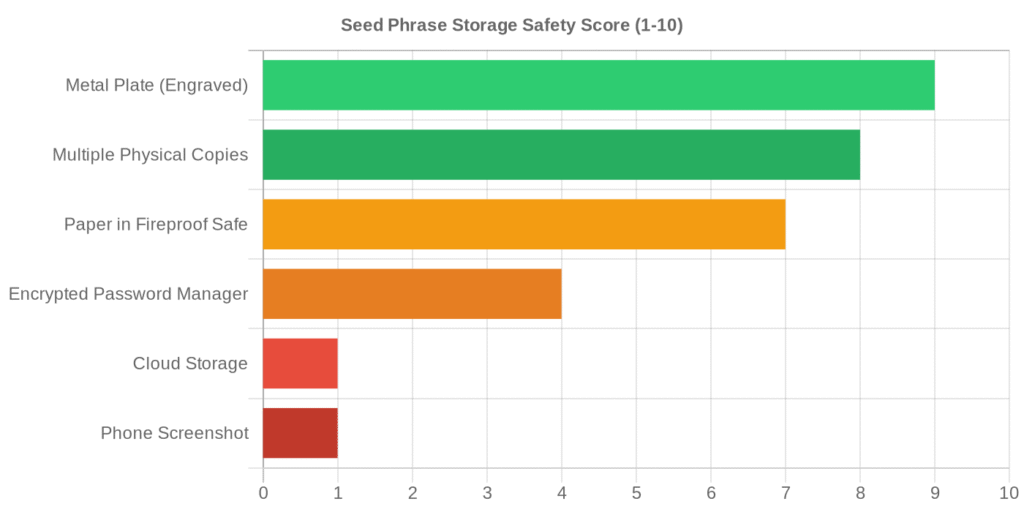 Seed phrase storage is not a solved problem. The crypto industry has spent a decade arguing about it, and no single method is perfect. But the hierarchy is fairly clear.