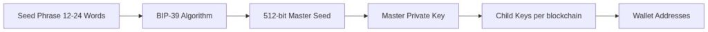 Your seed phrase feeds into a process called hierarchical deterministic (HD) wallet derivation. The phrase is converted into a 512-bit master seed using the PBKDF2 key-stretching algorithm. That master seed generates a master private key, which in turn derives an almost unlimited number of child keys — each one corresponding to a different wallet address on a different blockchain.