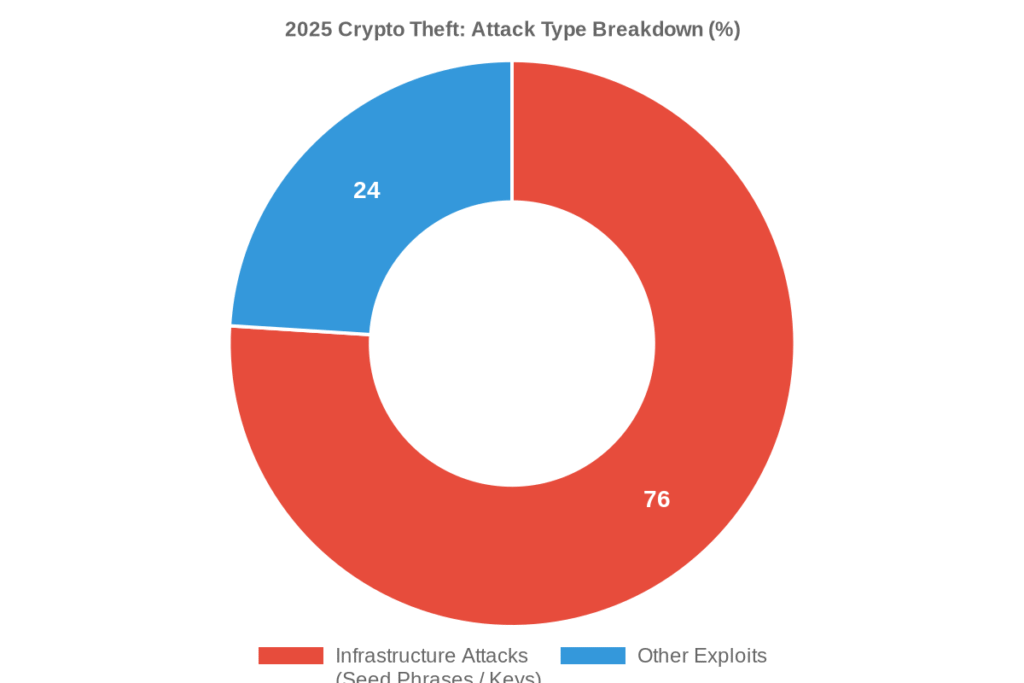 Infrastructure attacks — targeting seed phrases and private keys directly — drove $2.2 billion in losses in 2025, representing 76% of all crypto theft that year (TRM Labs 2026 Crypto Crime Report). The attack vectors are not exotic: